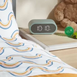 Bring cute style and functional flair to your child’s bedroom with this Clock with Nightlight from Pillowfort™. Designed in an oblong shape with a green frame, this clock with a nightlight adds a decorative touch to their room while helping them keep track of time. The clock is powered by an LED bulb that displays time in bright white light, with the option of changing the light color and dimming or enhancing the display. Plus, the alarm button at the back allows them to set or snooze an alarm with ease.