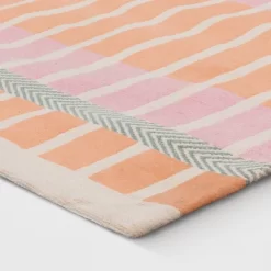 Add a vibrant splash of color to your child’s space with the Performance Indoor/Outdoor Rug from Pillowfort™. The rectangular area rug is adorned with a stylized striped pattern in pink, orange, cream and red hues, interspersed with chevron stripes in green and cream, for an eye-catching look that livens up any plain floor in an instant. The woven rug is made of a cotton-blend fabric for soft comfort underfoot, and the low-pile construction makes it easy to clean and place anywhere in their room or outside. Whether they lie on it to enjoy a fave book, play board games or watch TV, the decorative rug makes a fun and functional addition to your kid’s indoor or outdoor space.