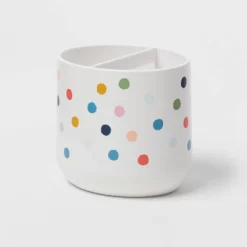 Bring a sweet update to your kiddo’s bathroom decor with this Multi-Dot Toothbrush Holder from Pillowfort™. This plastic toothbrush holder features an open-top design and it’s designed with two-way partitioning to easily organize toothbrushes, toothpaste and more. Adorned with multicolored dots on a cream base, it’s sure to add fun appeal to any bathroom decor. Coordinate with bath accessories with a similar print to create a cohesive look they’re sure to love.