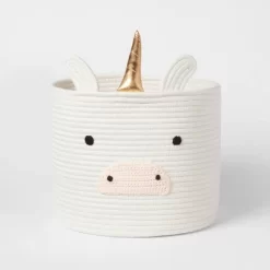 Declutter your kid’s space with this Unicorn Coiled Rope Kids’ Storage from Pillowfort™. This round storage basket features a cream coiled construction detailed with a unicorn face and a bright gold horn for a playful, magical look. The open top makes it easy to stash away toys, books and other items. Plus, the two tote handles on top allow for easy carrying.
