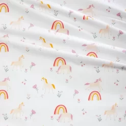 Dress your kiddo’s bed in magical style with the Unicorn Cotton Sheet Set from Pillowfort™. Made of a brushed, 100% cotton fabric, this 220-thread-count bed sheet set is soft to the touch, and it’s decorated with a vibrant print of unicorns, rainbows, flowers and fruits against a white background to add a dash of cheerful flair to their room. Perfect for year-round use, this unicorns and rainbows sheet set comes with a fitted sheet, flat sheet and matching pillowcase(s) for a complete look. The fully elastic fitted sheet is suitable for mattresses up to 16 inches deep to ensure a snug, secure fit and create a smooth, soft surface for your child to lay on. Machine washable for easy care and cleaning, this bedding set is perfect for everyday use — add a solid or printed coverlet or comforter, and complete the look with cute rainbow- and unicorn-shaped pillow buddies.